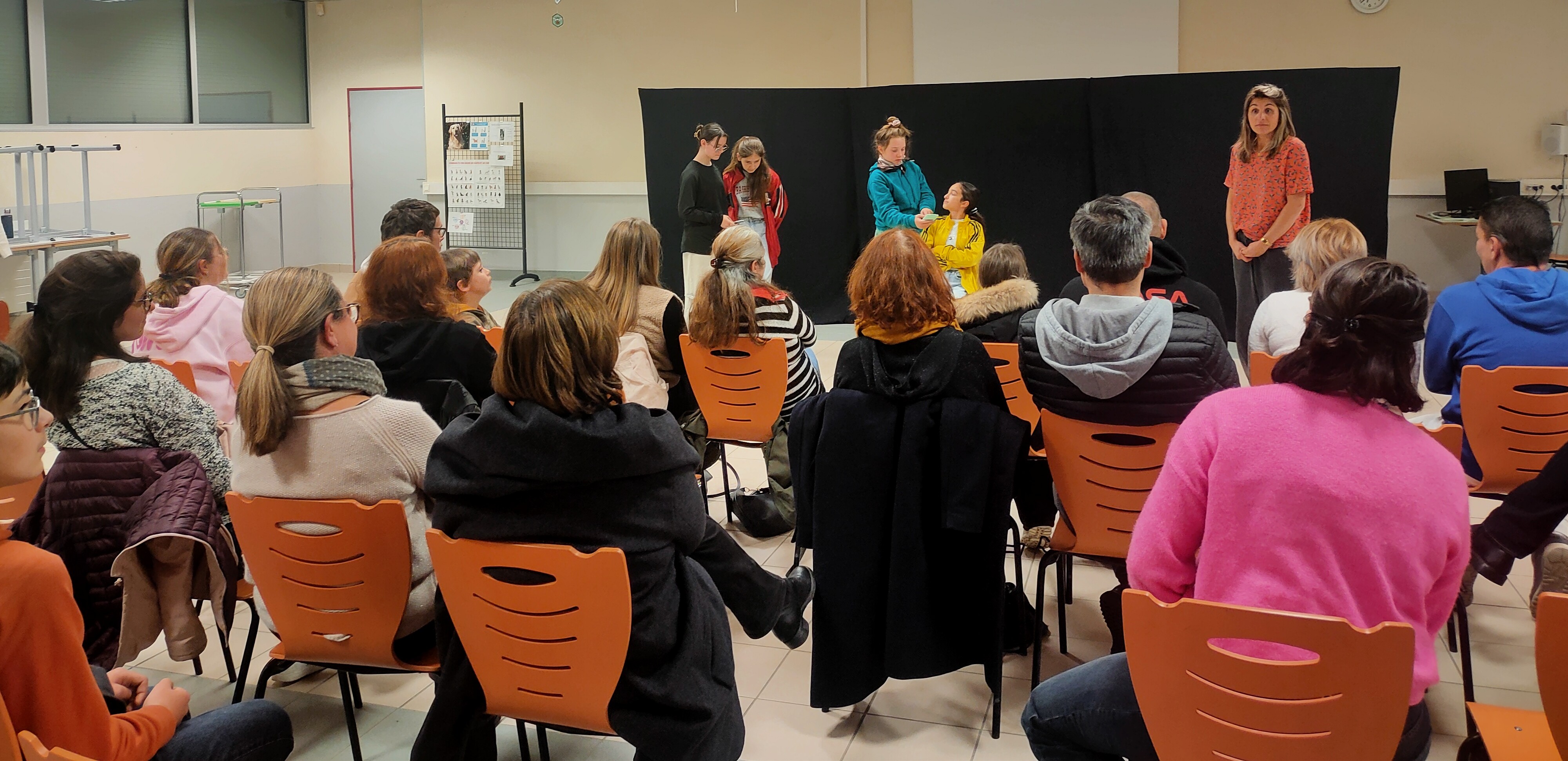 Après avoir participé à un atelier de théâtre parents-enfants, les 5e du groupe inspiration ont préparé des saynettes pour faire réfléchir les familles à des situatiosn de vie scolaire. Un agréable moment de partage !